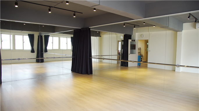 教室備軟黑膠地板、木頭地板、大面落地鏡子、藍芽喇叭、冷氣。 提供桌椅、白板、和室椅、課桌椅、大小cube、衣車等排練適用替代道具。